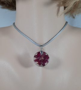 Jewelry set made of Epoxy resin and dwarf rose petals. The set consists of a ring and a necklace. The metal parts are made of stainless steel. In the case of the necklace, the pendant is held by a cord made of artificial leather.Prsten je univerzalne velicine, podesiv je. Glava prstena je od epoxy smole, koji je u precniku 19mm. Privezak je u precniku 25mm.