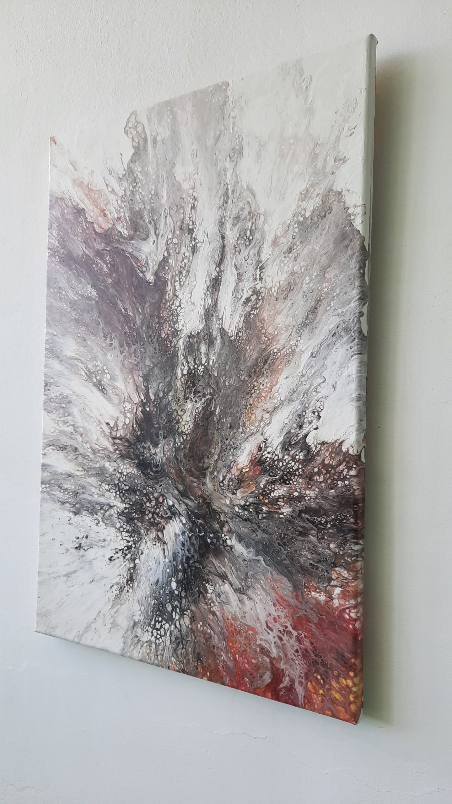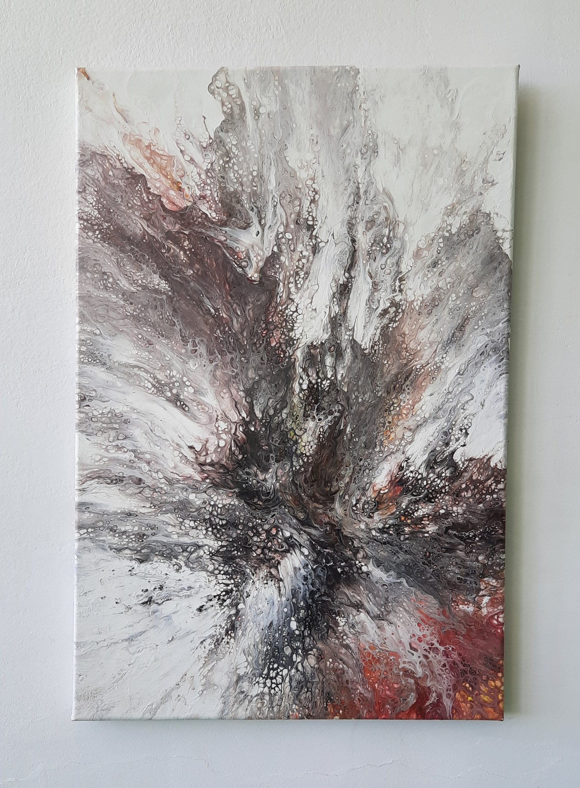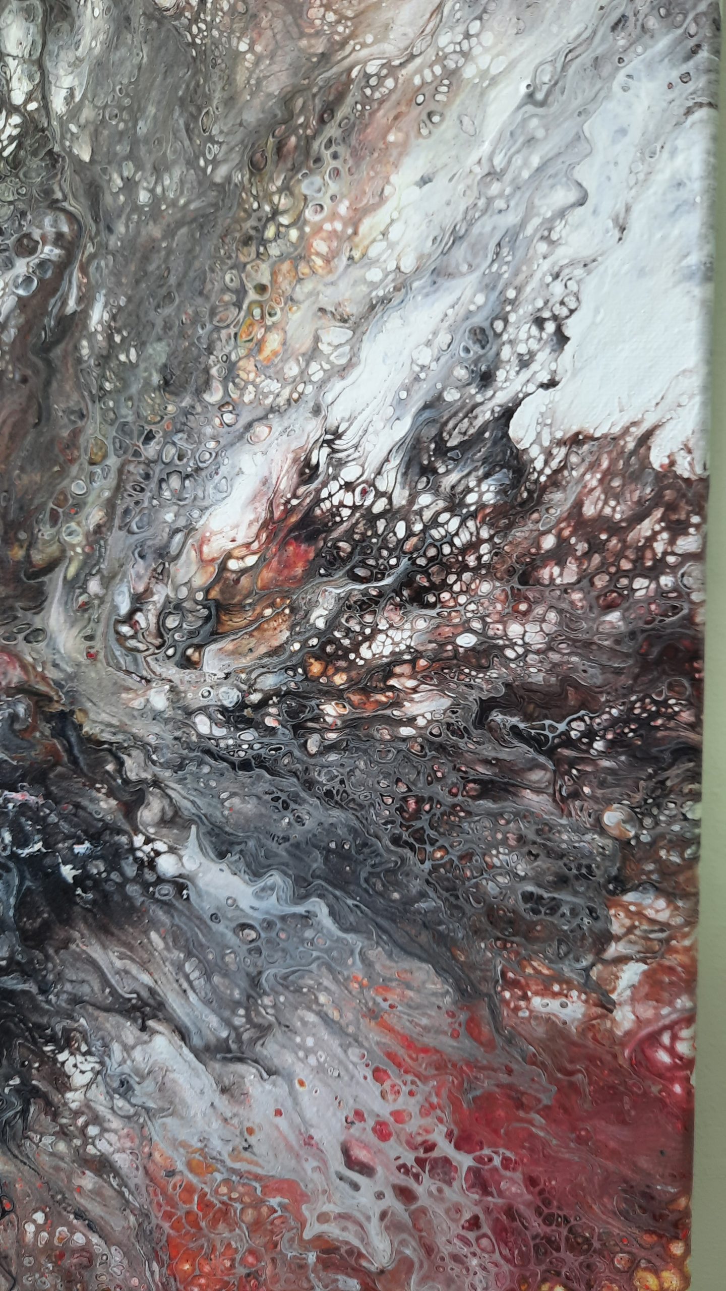 Original 60x40cm fluid art painting in red, black, white and yellow on thin canvas. Perfect decoration for a modern home.
