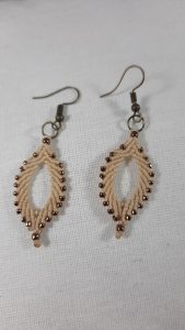 Earrings made with macrame technique, beige color with Japanese Toho copper colored glass covers. The hook is made of stainless steel.