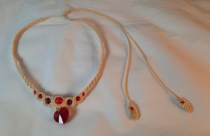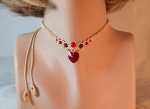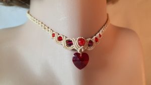 Micro Macrame Choker with Swarovski Siam red Bicone and Siam red Heart Pendant. I used beige wax thread to make this jewelry.