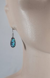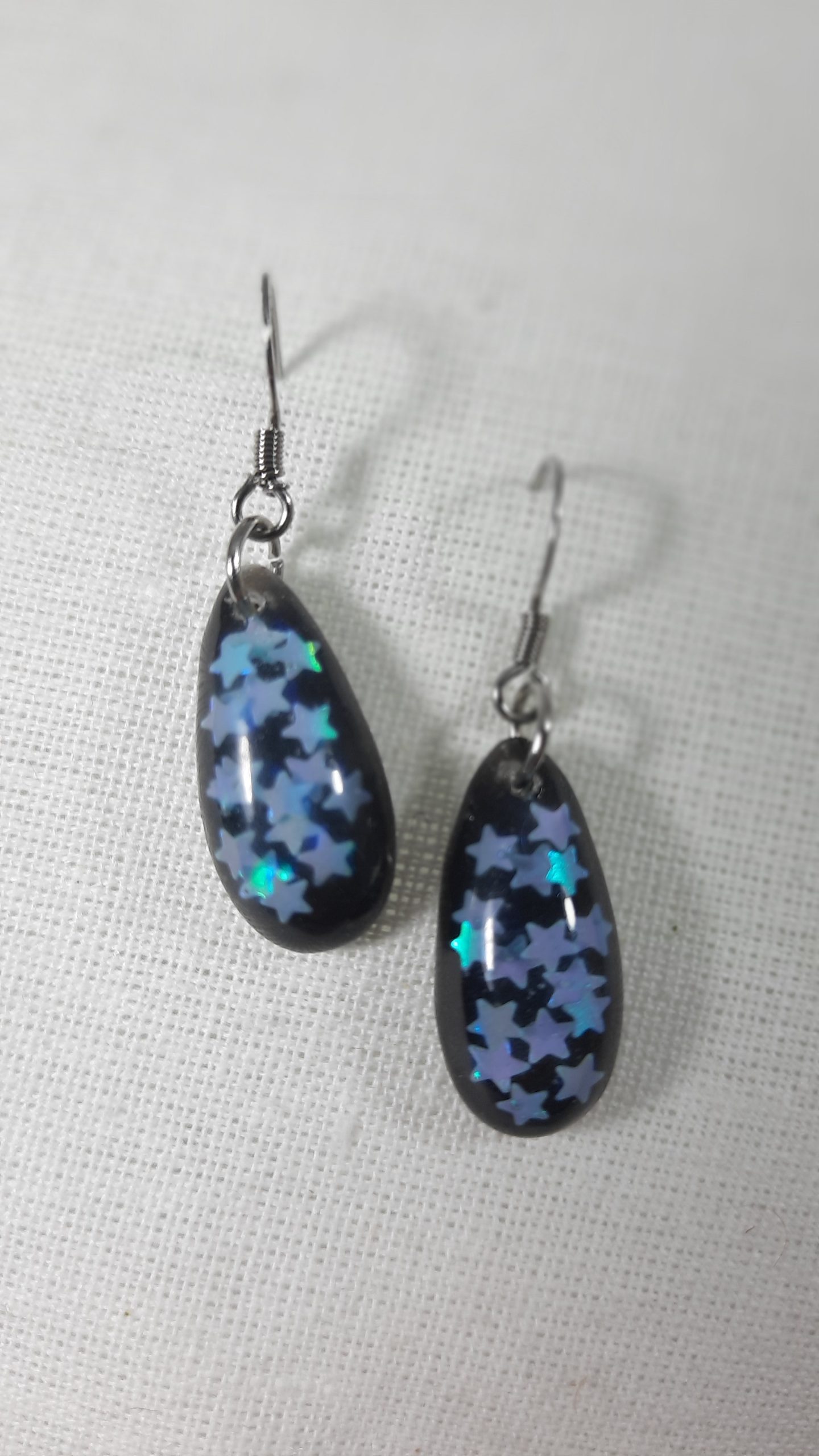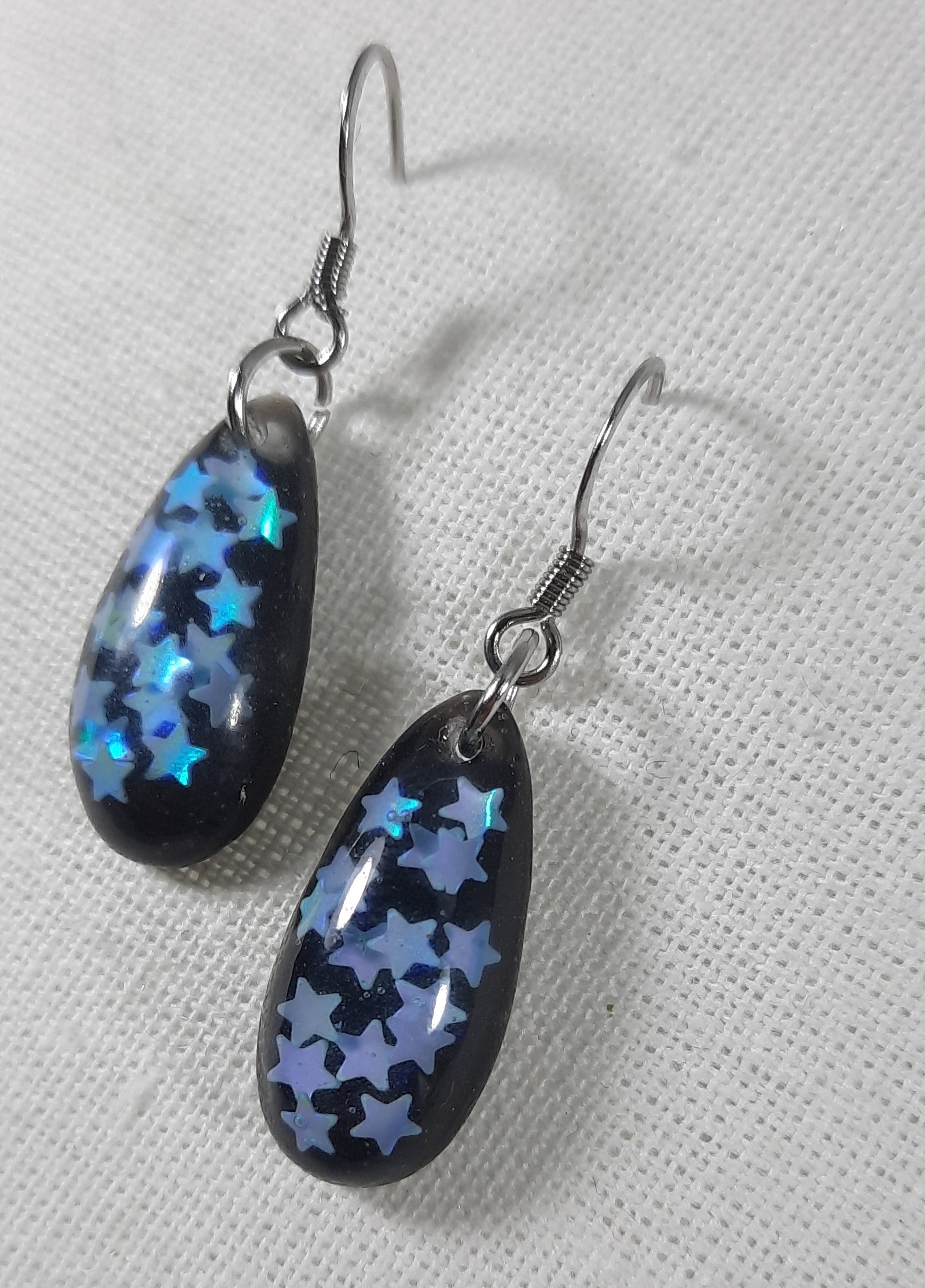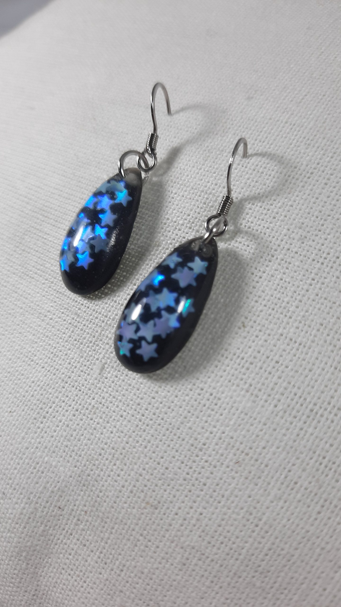Unique Epoxy Resin Earrings with Chameleon Colour Stars and with a black background. The hook is made of stainless steel.