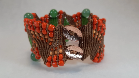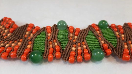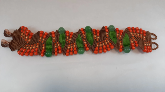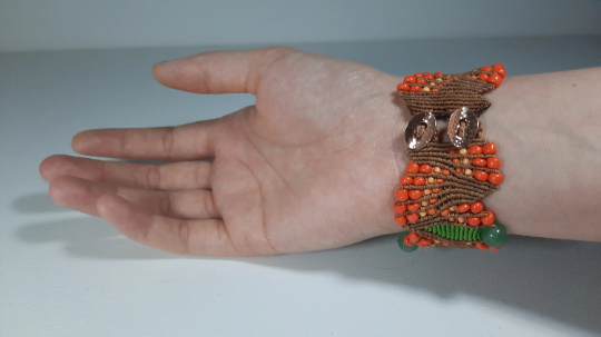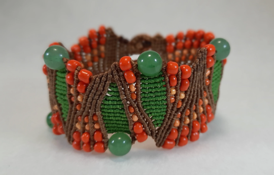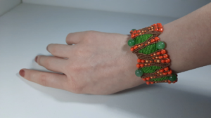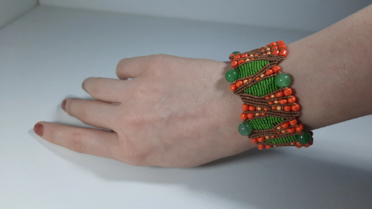 Making the bracelet, I used Green Aventurine Gemstone – 8mm, brown and green color 0,8mm waxed thread and orange color high-quality Chech Preciosa glass beads.