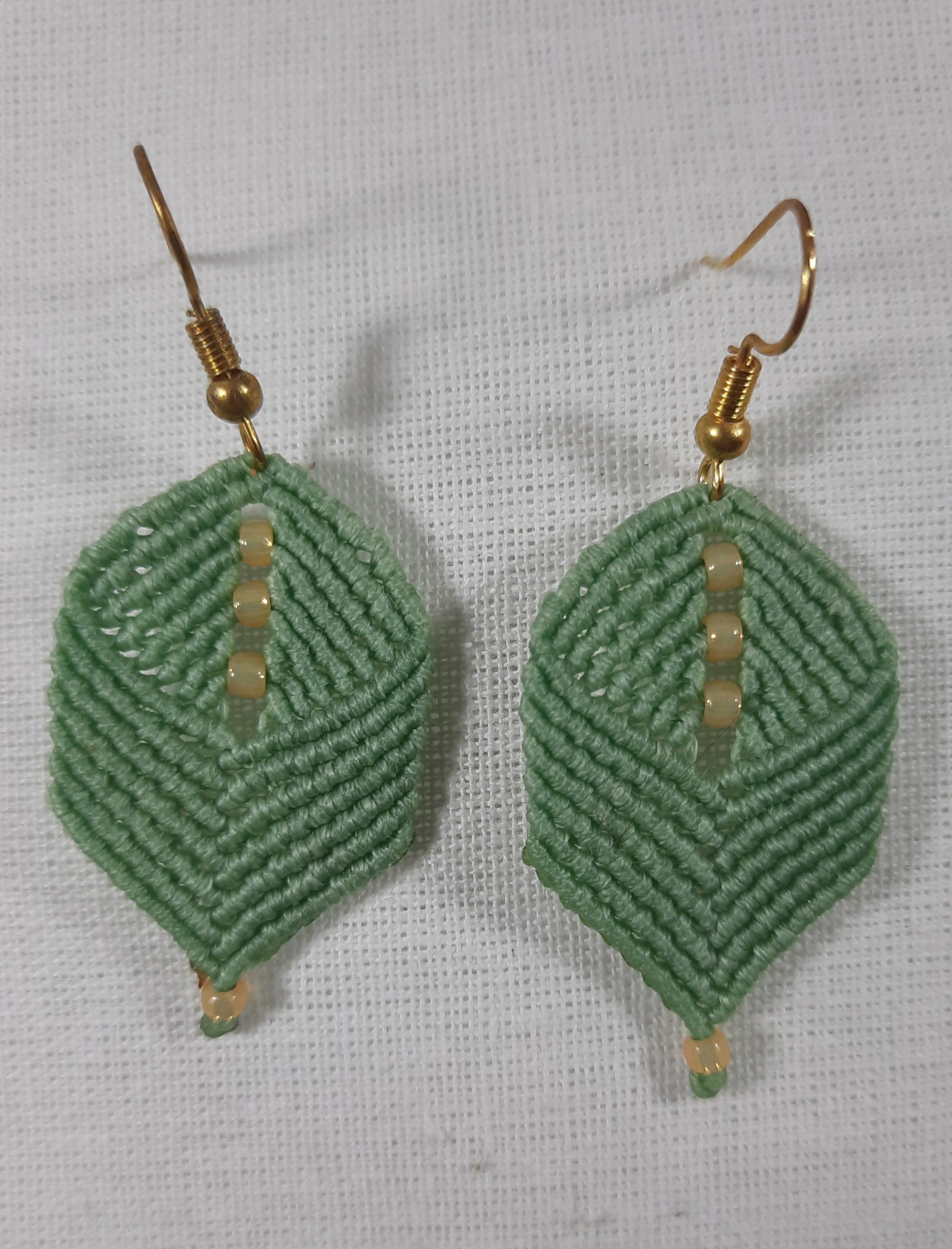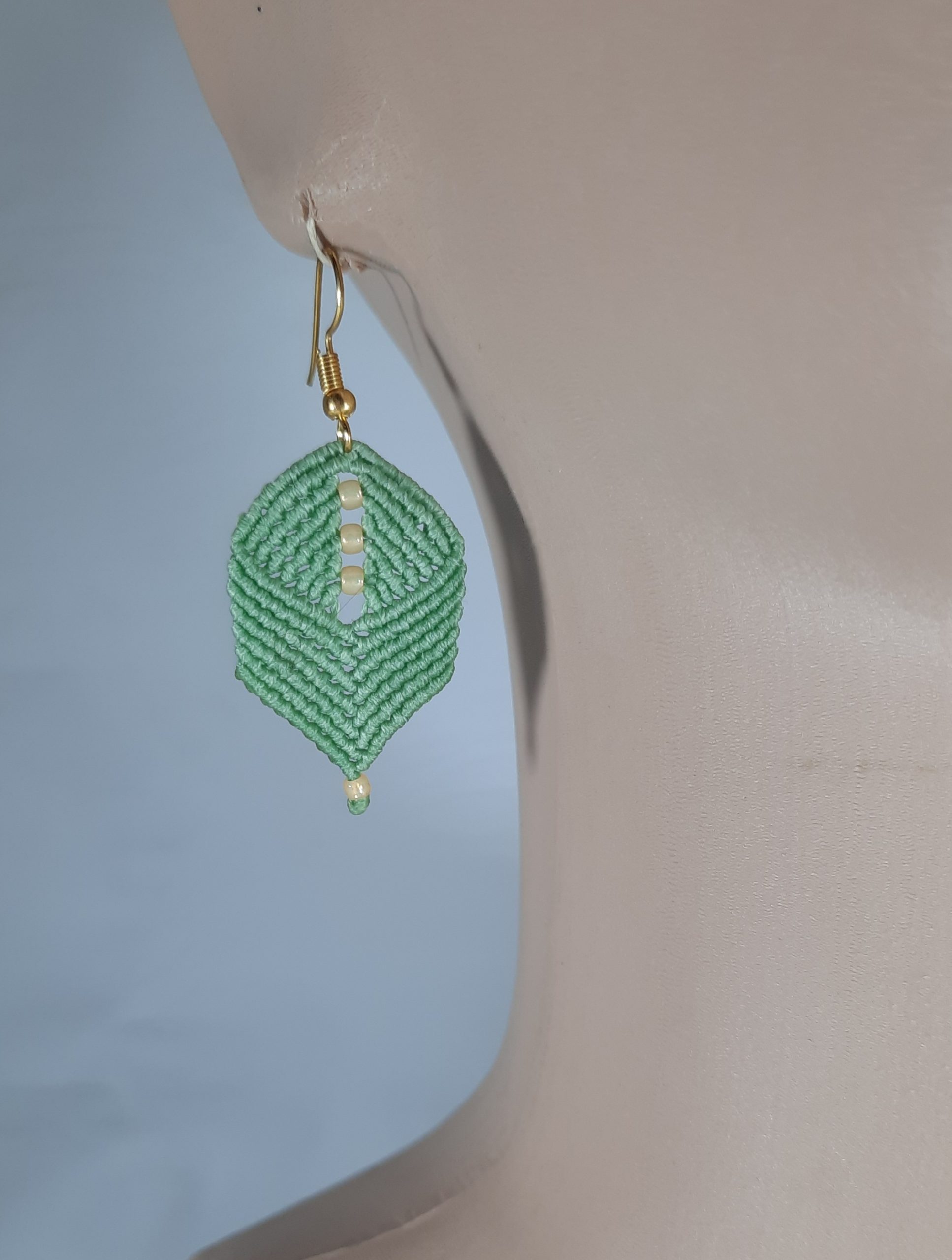 Earrings made using the macrame technique from mint green waxed thread with Japanese Toho beige colored glass beads. The hook is made of stainless steel.