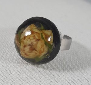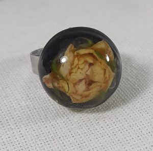 Unique Women’s ring made of stainless steel and epoxy resin with a home-dried dwarf rose from my flower garden on a black background. Ring diameter adjustable, ring head 18 mm.